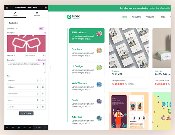 Semua perubahan hanya dilakukan melalui widget Elementor, sehingga memudahkan Anda untuk mengelola tab produk.