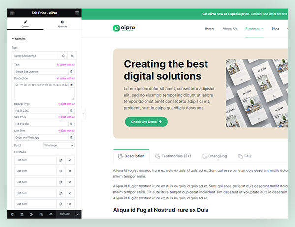 eiPro menawarkan tingkat kustomisasi frontend yang lengkap tanpa perlu skill pengkodean.