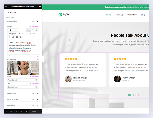 Semua perubahan hanya dilakukan melalui widget Elementor, sehingga memudahkan Anda untuk mengelola isi testimonial.