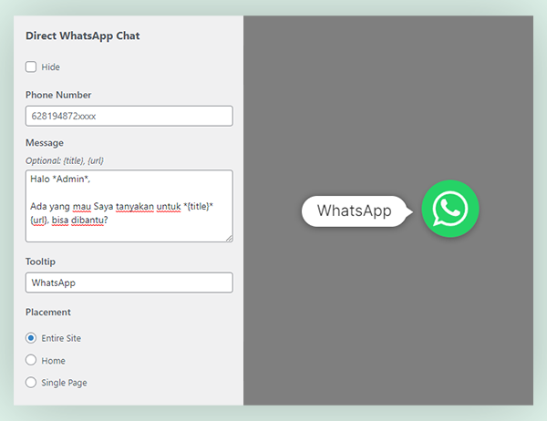 Pelanggan dapat menghubungi Admin secara langsung melalui WhatsApp. Dengan fitur ini, Admin dapat membuat pesan khusus yang dapat dikirim kepada pelanggan untuk memulai percakapan.