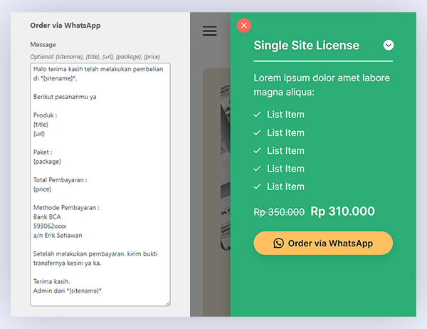 Fitur yang tersedia pada theme eiPro Business, memungkinkan pelanggan untuk melakukan pemesanan produk melalui WhatsApp. Fitur ini sangat cocok untuk bisnis yang tidak memiliki Member Area, tetapi masih ingin memberikan opsi kepada pelanggan untuk mengirim pemesanan melalui WhatsApp.