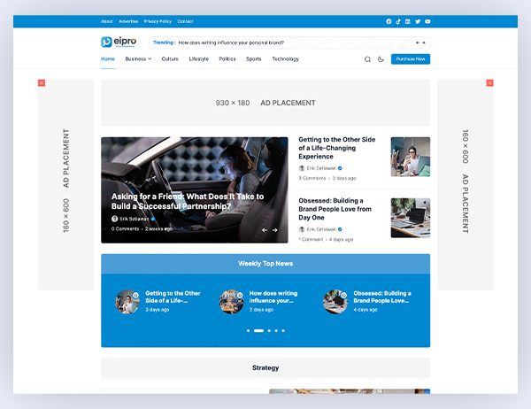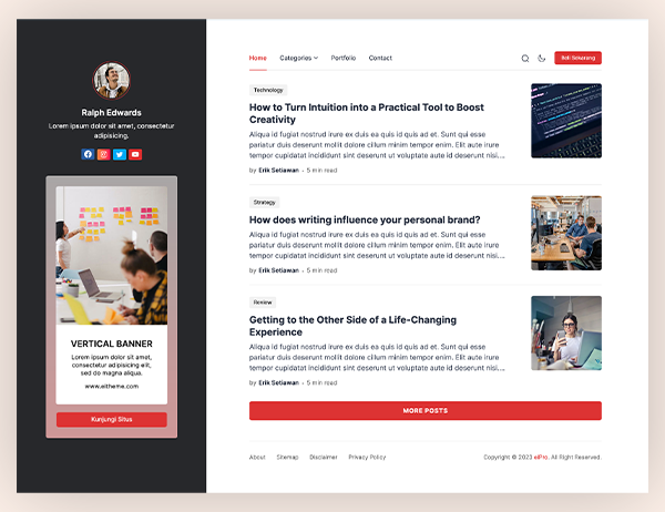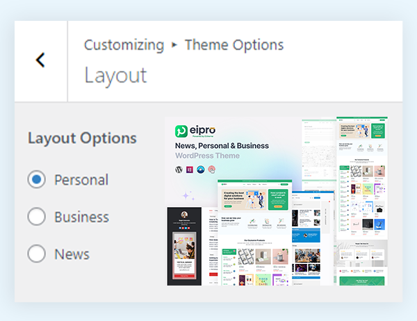 Salah satu fitur super keren yang belum ada dimanapun. eiPro memiliki pilihan layout untuk News, Personal, Business. Dengan fitur ini, Anda bisa setting sesuai kebutuhan.