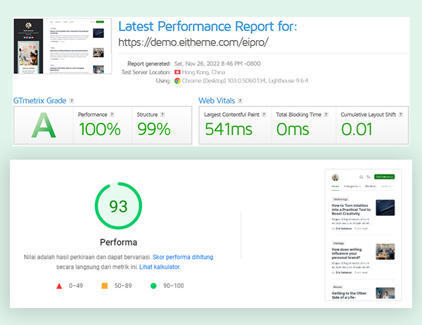 Theme sudah di optimalkan, ringan dimuat dengan sangat cepat. Di kodekan dengan baik, sehingga memungkinkan untuk mendapatkan skor tinggi pada beberapa uji kecepatan situs web melalui PageSpeed Insights, GTmetrix, Lighthouse.