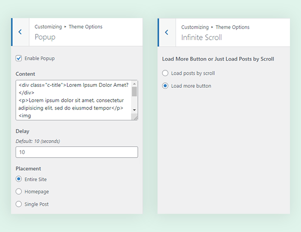 Kemudian tersedia juga fitur Infinite Scroll, bisa pilih (Load posts by scroll, Load more button).