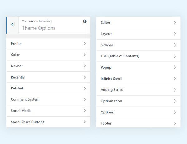Anda dapat mengatur situs web hanya dengan beberapa klik di Theme Options. Ini tidak hanya sangat efektif, tetapi juga menyenangkan karena bisa melihat perubahan pratinjau situs web secara langsung.